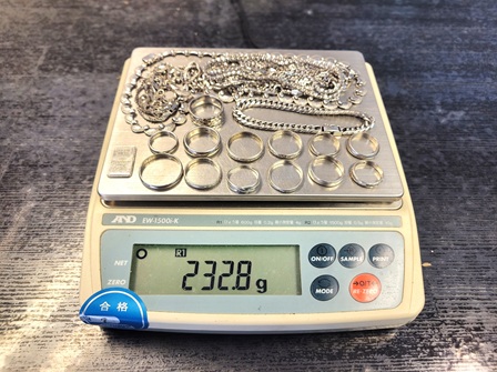 - プラチナのインゴット、Pt1000の指輪、Pt950の指輪、Pt 900の指輪、Pt850の喜平ブレスレット、Pt850のネックレス、PM刻印の指輪:合計232.8g
